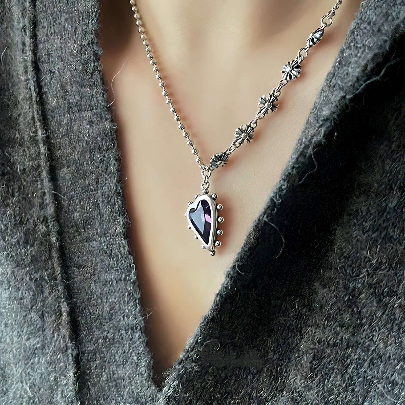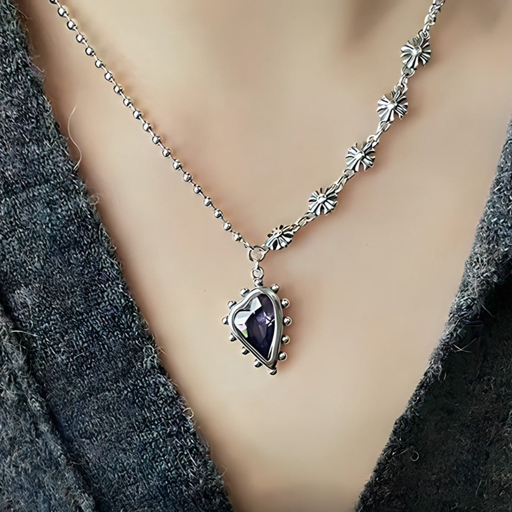 Este collar en Plata 925 auténtica es una joya que combina misticismo y arte en cada detalle. Su cadena adornada con flores en relieve guía la mirada hacia el centro: un colgante en forma de gota invertida con una circonia cúbica morada, rodeada por un marco de esferas plateadas que evocan diseños artesanales de espíritu libre.