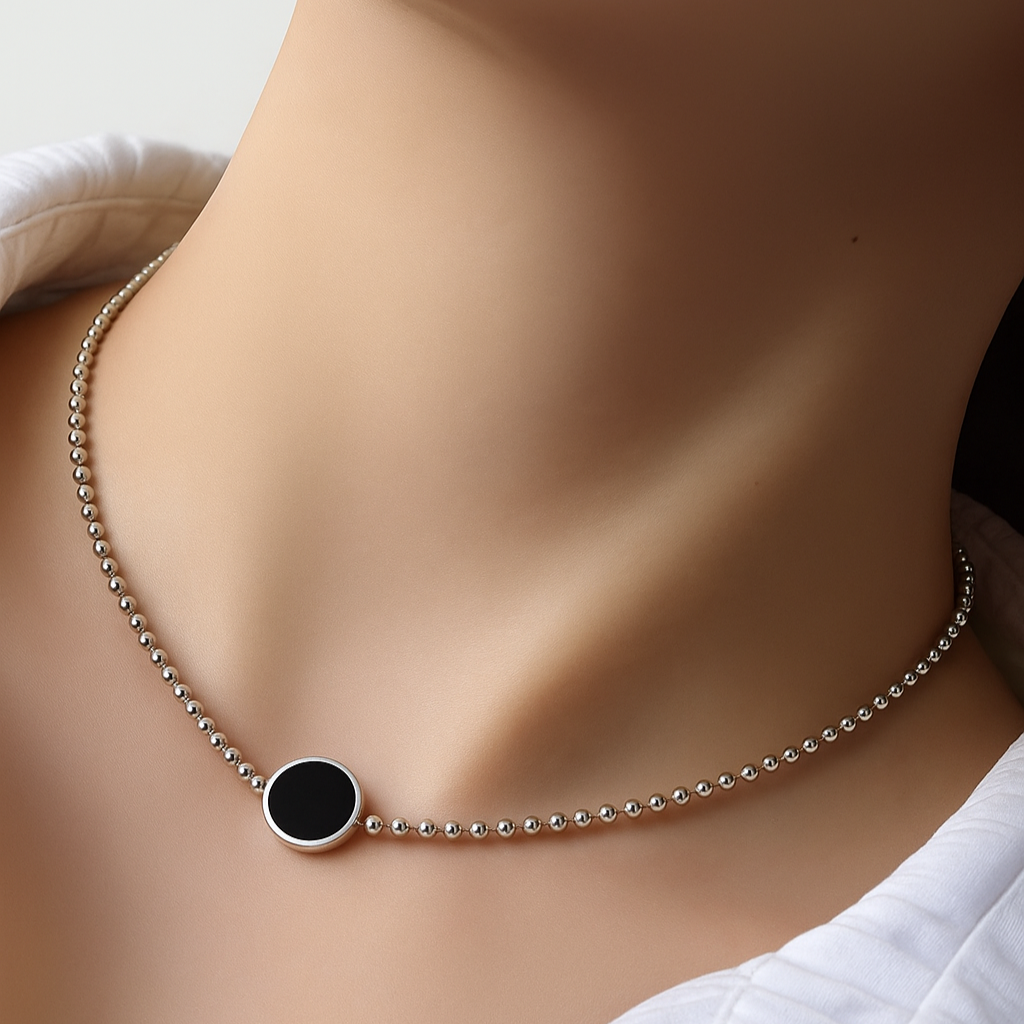 Tory destaca por su estructura simple y su dije redondo negro que aporta profundidad, sobriedad y elegancia. Perfecto para looks sofisticados y monocromáticos, o como base para un estilo elegante y moderno.