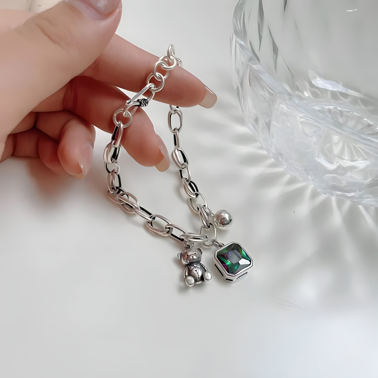La Pulsera Lumi combina una elegante cadena de eslabones con tres dijes llenos de personalidad: un pequeño oso que evoca ternura y protección, una esfera brillante que simboliza la energía del presente, y una piedra cúbica multicolor que refleja la belleza cambiante de la vida. Cada detalle está pensado para recordarte que tu brillo es único y está hecho para destacar.